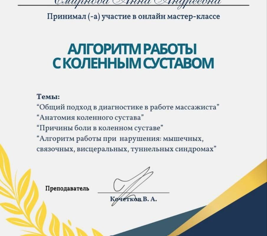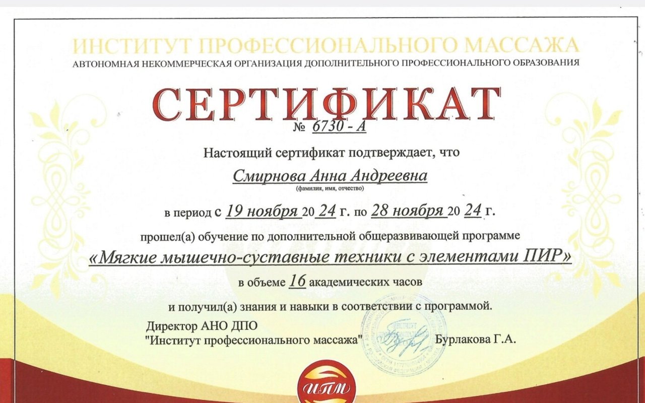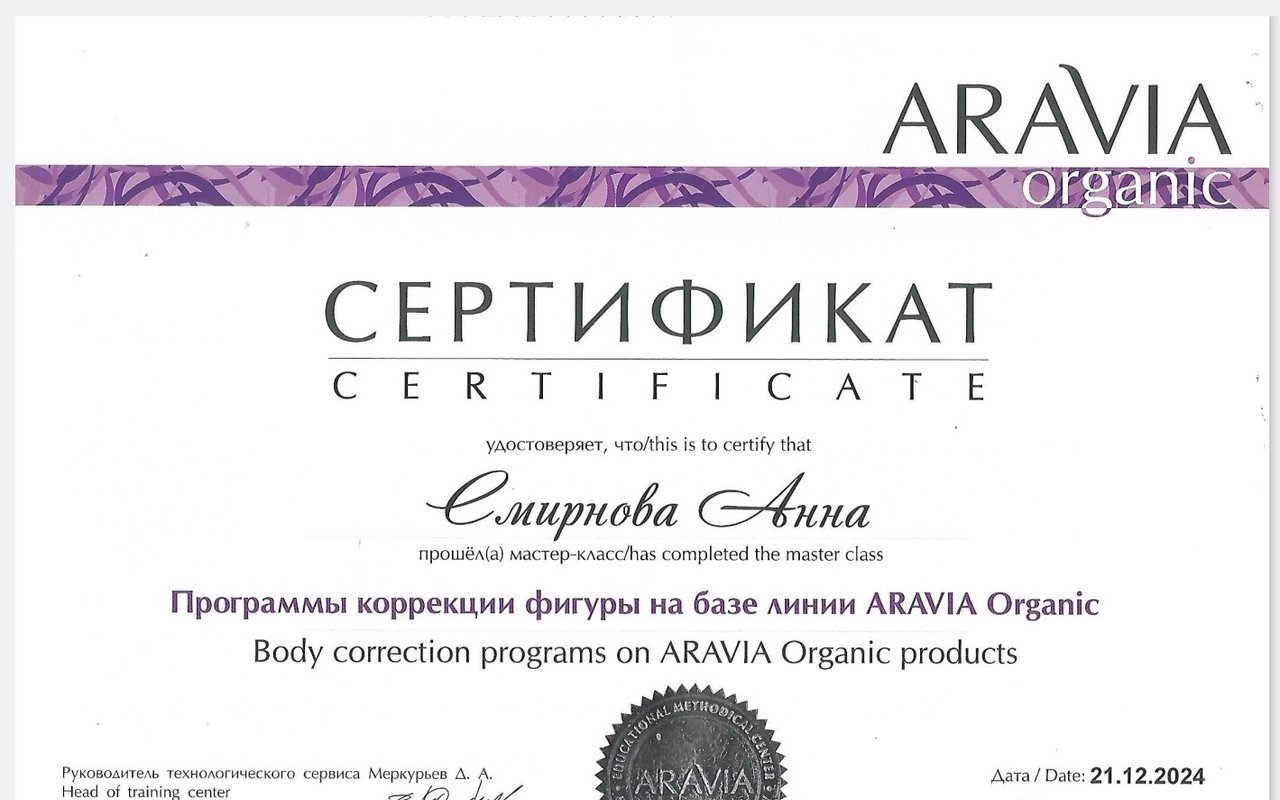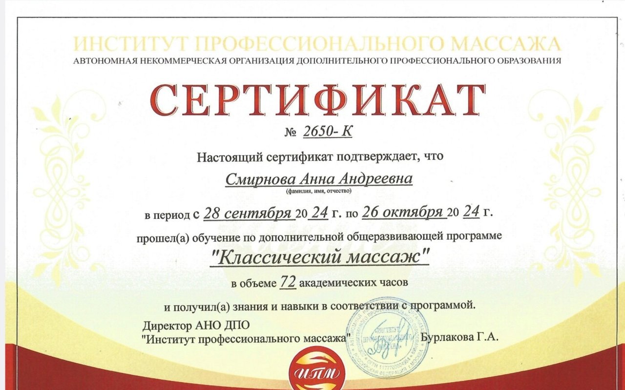 Кроме того, Смирнова Анна Андреевна предлагает такие услуги, как антицеллюлитные обёртывания, обертывания, спа-процедуры, ароматерапия. Анна постарается сделать так, чтобы вы стали ее постоянным клиентом.... Показать еще