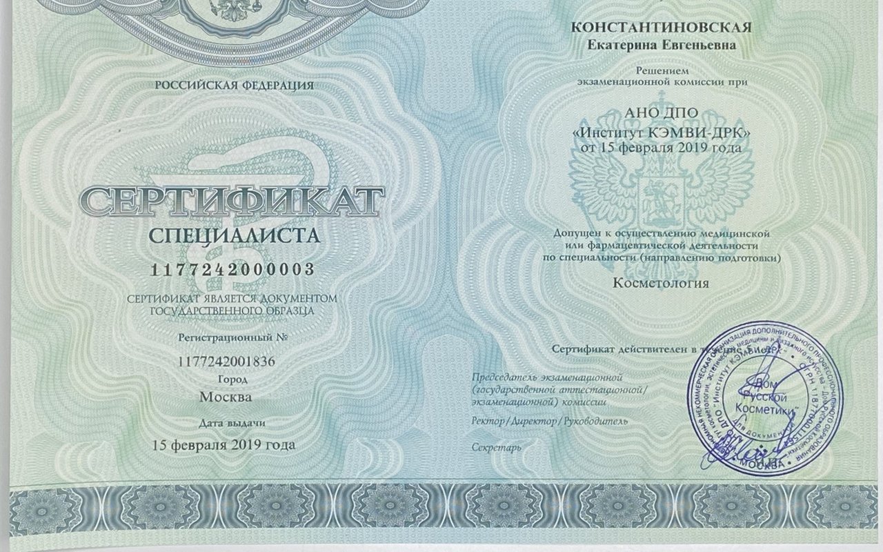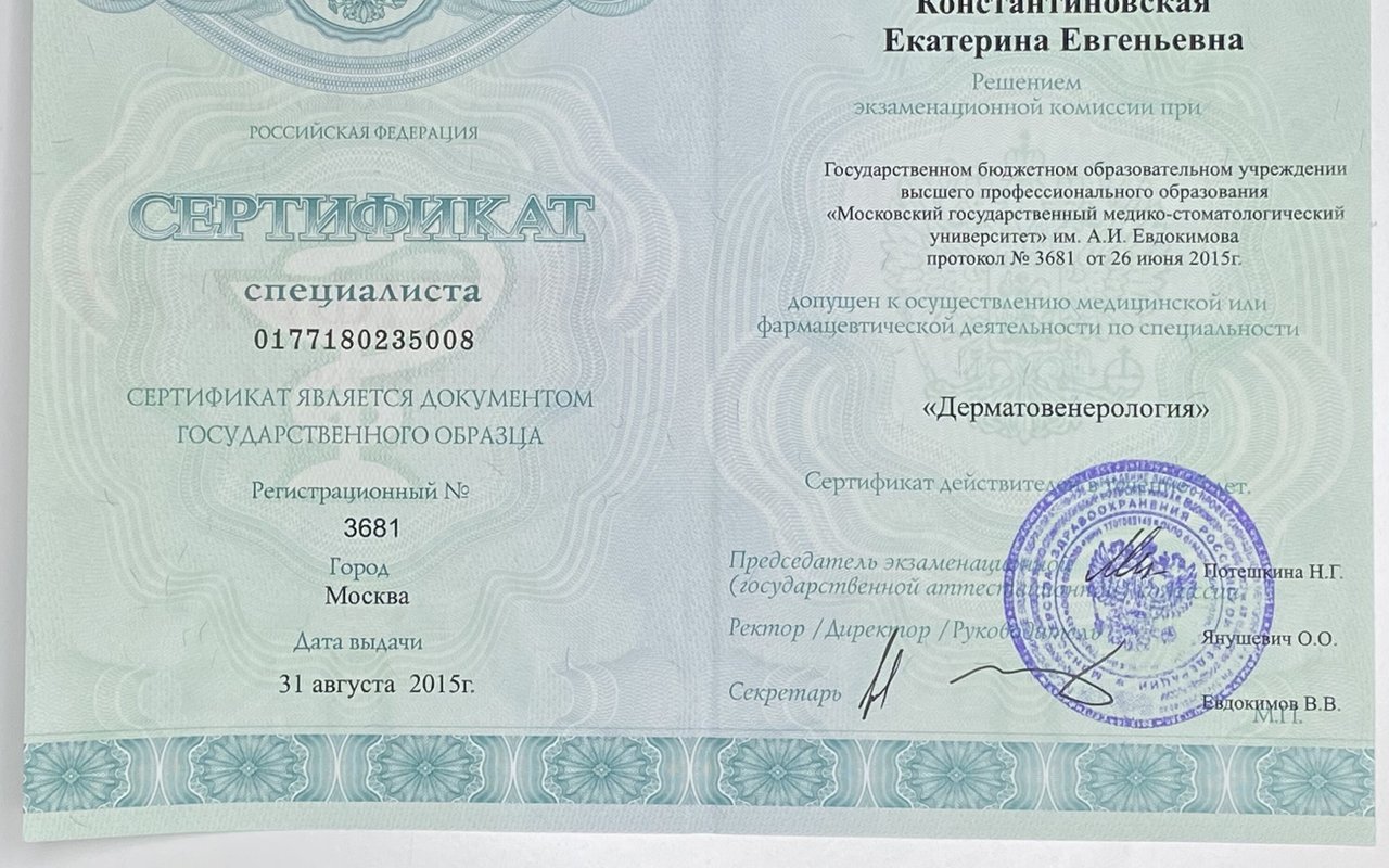 Екатерина Евгеньевна Константиновская — профессиональный дерматолог и косметолог с 11-летним опытом. Пациенты ценят её за внимательное отношение, грамотный подход и способность успешно справляться с такими проблемами, как акне. Многие отмечают, что после её лечения их кожа стала чистой и ухоженной, а самочувствие поднялось. Екатерина Евгеньевна — врач, которому доверяют и рекомендуют своим близким.