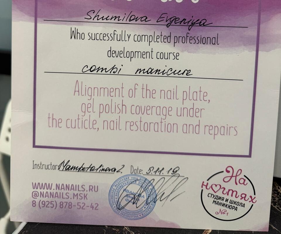 Шумилова Евгения как бьюти-специалист сделает все возможное, чтобы вы стали ее постоянным клиентом. Она предлагает такие услуги, как восстановление ногтей, экспресс-педикюр, гелевый, классический, комбинированный, медицинский и мужской педикюр.... Показать еще