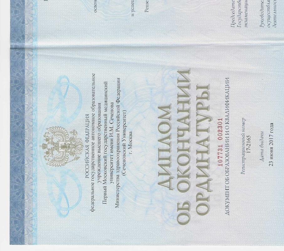 2015–2017 — Первый Московский государственный медицинский университет имени И.М. Сеченова. Ординатура по направлению "Пластическая и реконструктивная хирургия"