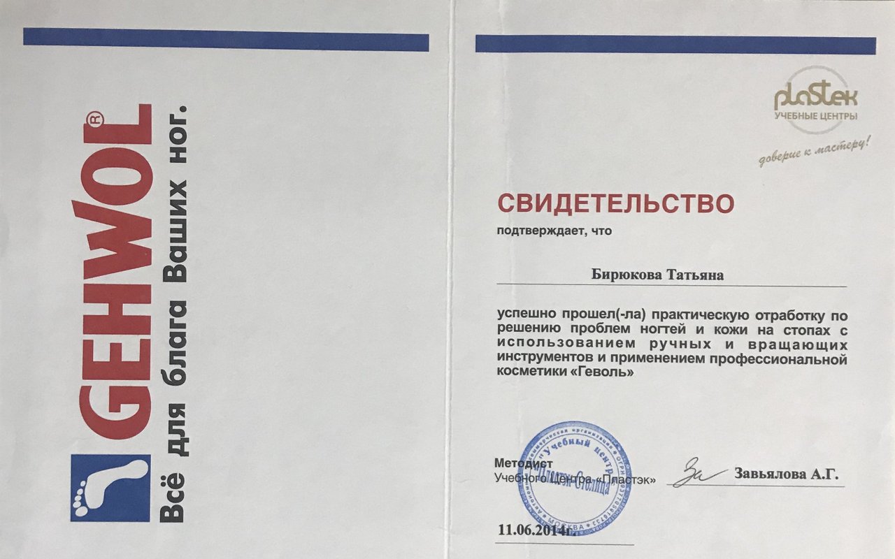 2014 — Gehwol «Практическая отработка по решению проблем ногтей и кожи на стопах с использованием ручных вращающихся инструментов и применение профессиональной косметики «Геволь»