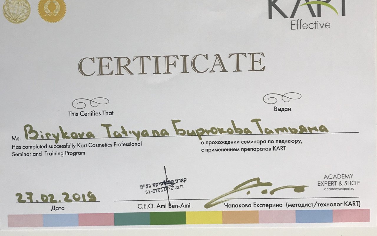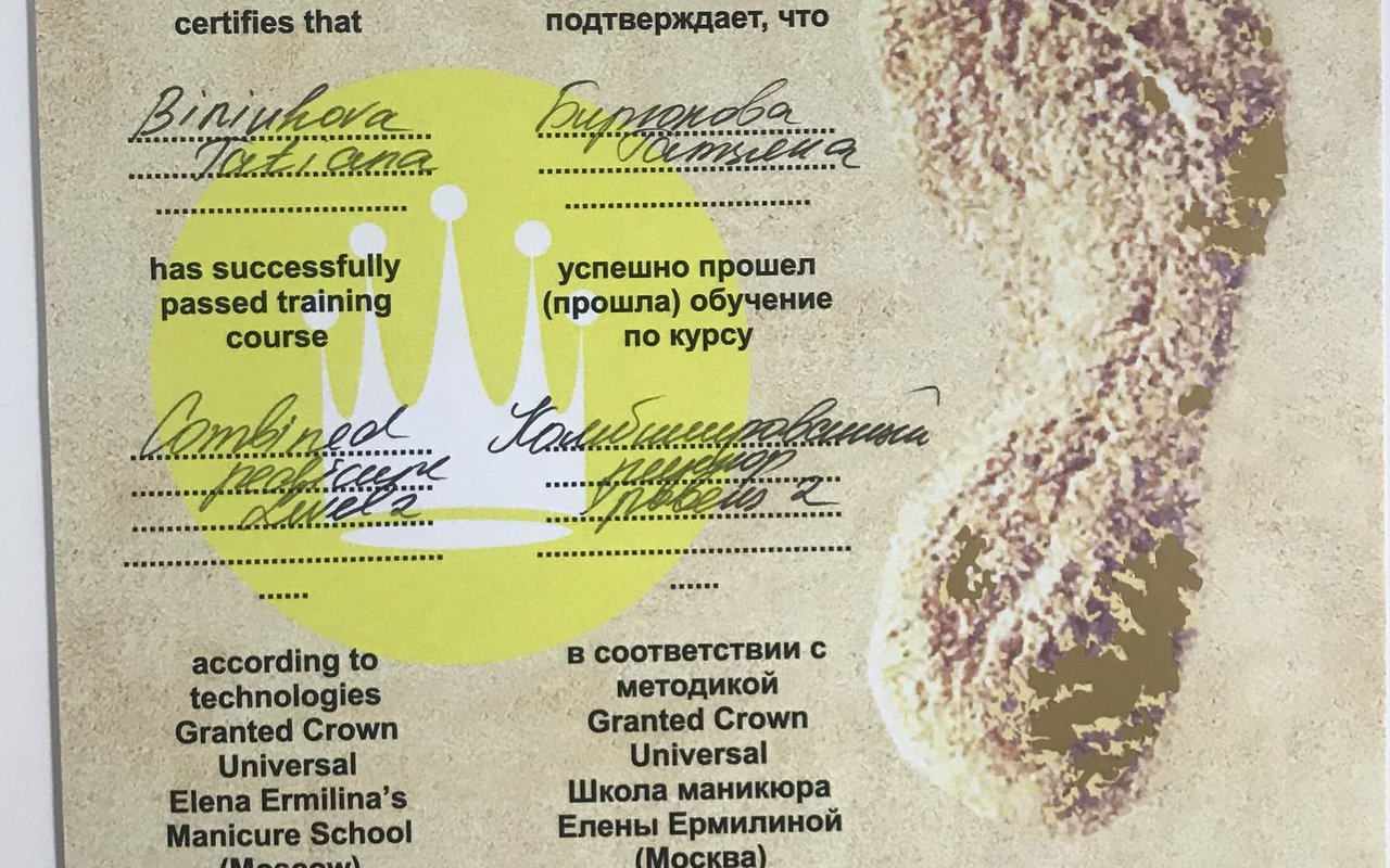 2020 — ЧОУ ДПО Учебный центр косметологии и технологии СПА «Биофотоника» «Специалист по предоставлению педикюрных услуг»