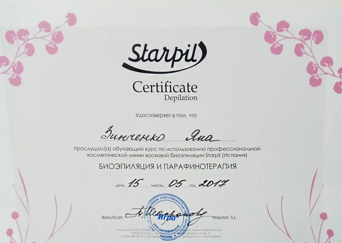 - Есть ли у Зинченко Яны Сергеевны требуемые сертификаты?