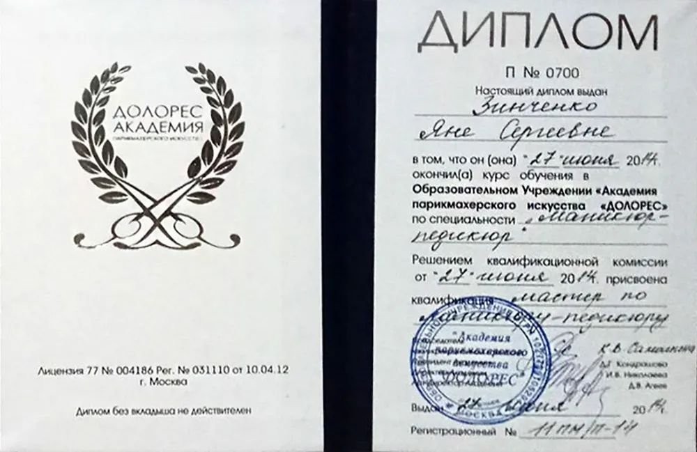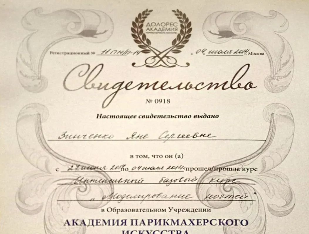 2014 — Академия искусства «Долорес», мастер-универсал ногтевого сервиса