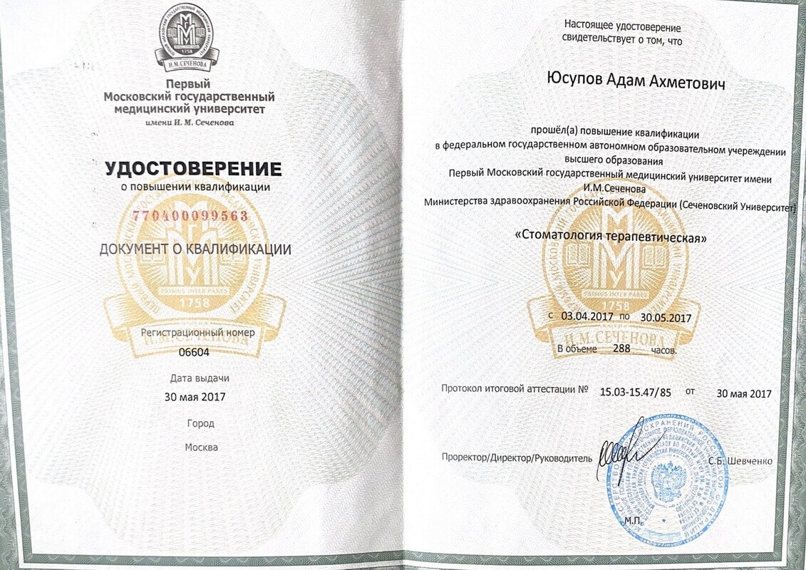 2017 — Первый Московский государственный медицинский университет имени И. М. Сеченова Министерства здравоохранения Российской Федерации (Сеченовский Университет). «Стоматология терапевтическая»