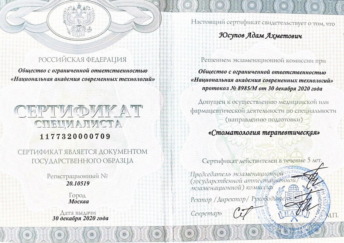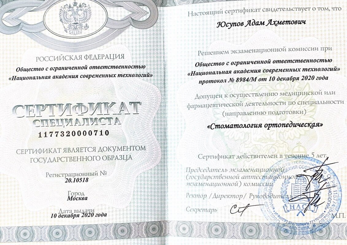 Юсупов Адам Ахметович является стоматологом-ортопедом. Вы можете обратиться к Адаму Юсупову, если вам требуется заменить утраченный зуб или если какой-либо из зубов разрушен до такой степени, что с помощью обычной пломбы его не спасти. Зубы перед протезированием должны быть должным образом санированы, так что перед обращением к ортопеду стоит посетить стоматолога-терапевта.
