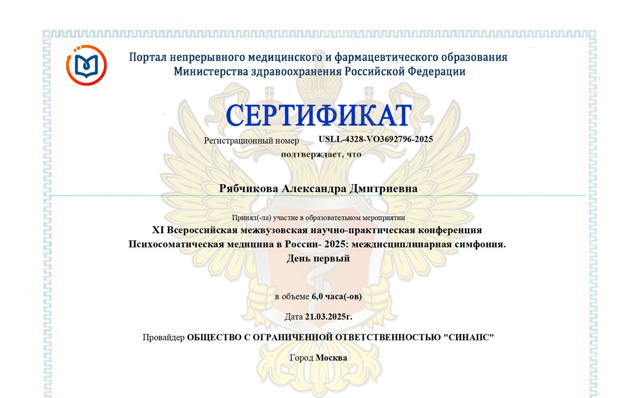 Александра Дмитриевна постоянно совершенствует свои профессиональные навыки и знания, участвуя в различных тренингах, семинарах и конференциях в области психиатрии и психотерапии. В своей работе она применяет современные методики лечения и диагностики, следуя принципам эффективности и безопасности для пациентов.