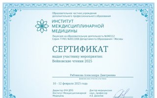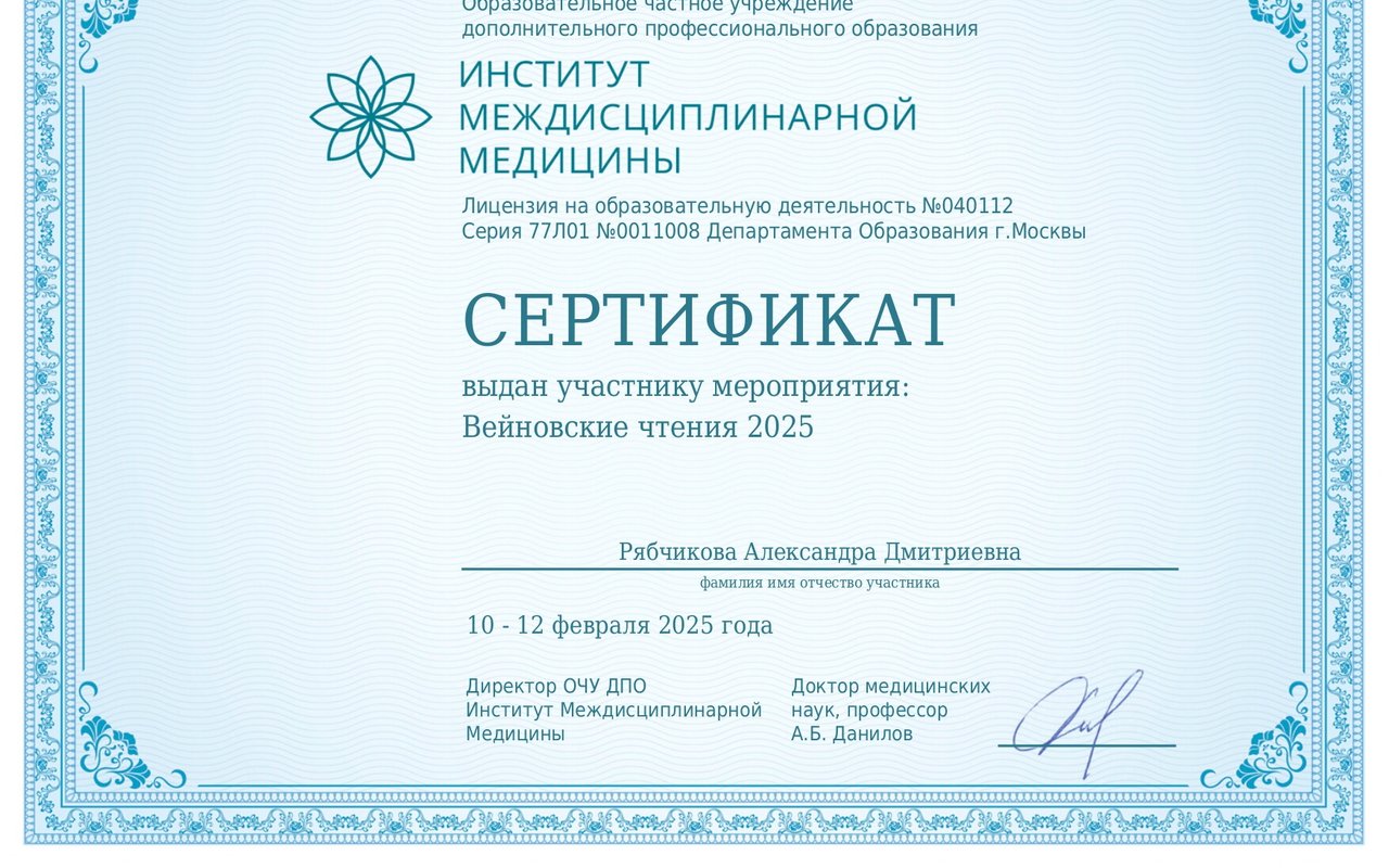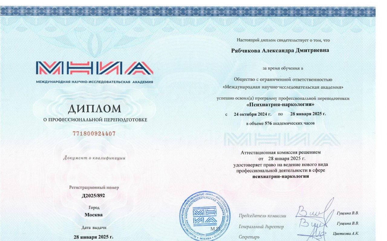 Так же она является членом Академии Междисциплинарной Медицины, что позволяет ей быть в курсе последних научных достижений в области психиатрии и наркологии. Участие в академии помогает расширять свои профессиональные горизонты и находить новые подходы к решению медицинских проблем у пациентов.