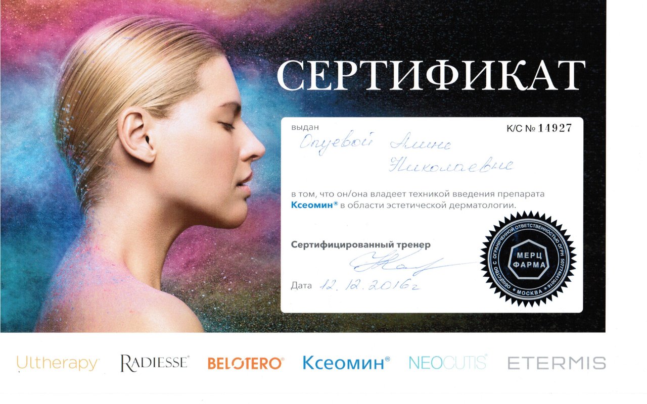 2016 — Сертификат о владении техникой применения ботулинического токсин типа A препарата «Ксеомин» (Merz Aesthetics)