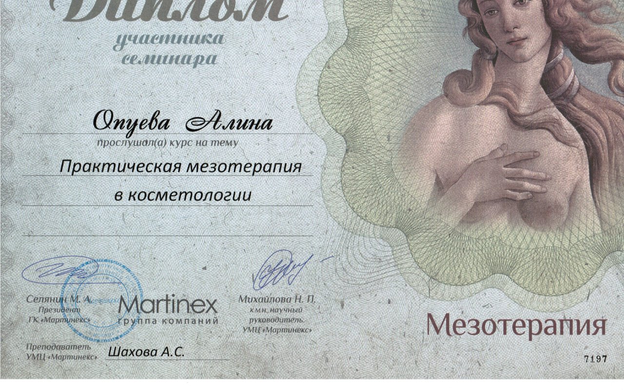 2016 г. — Сертификат специалиста по контурной пластике препаратами Revanesse (Бэст Эстетика). 2016г. — курс теоретического и практического обучения по применению химических пилингов Easy Phytic Peel, Easy peel, Only touch peel (Валлекс М). 2016 г. — Семинар по тредлифтингу. Имплантация линейных,спиральных и игольчатых мезонитей Lead Fine Lift. (Beauty Expert).