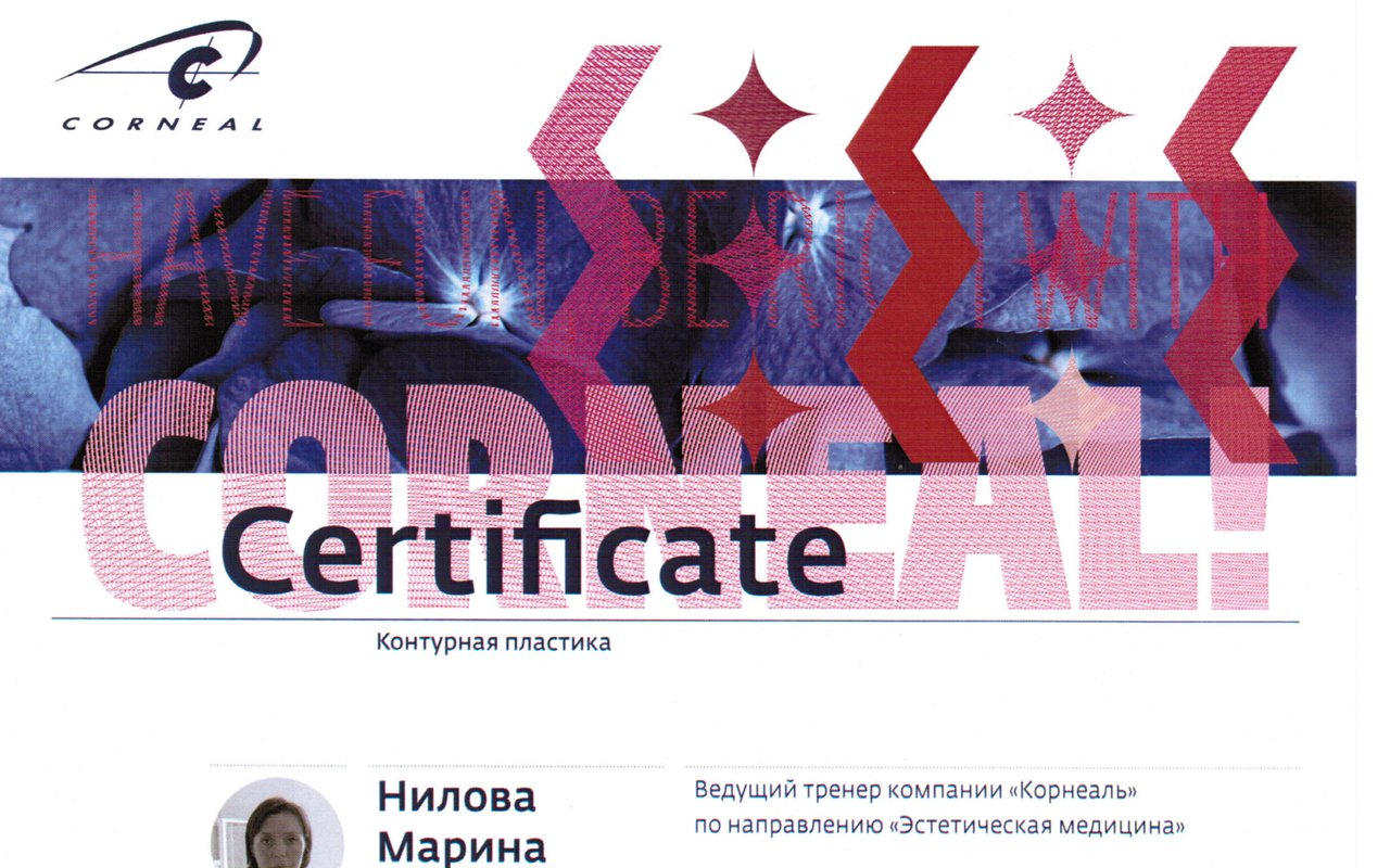 2016г. — Сертификат специалиста по контурной пластике препаратами Restylane, Perlane, Vital, Lipp. (Galderma).