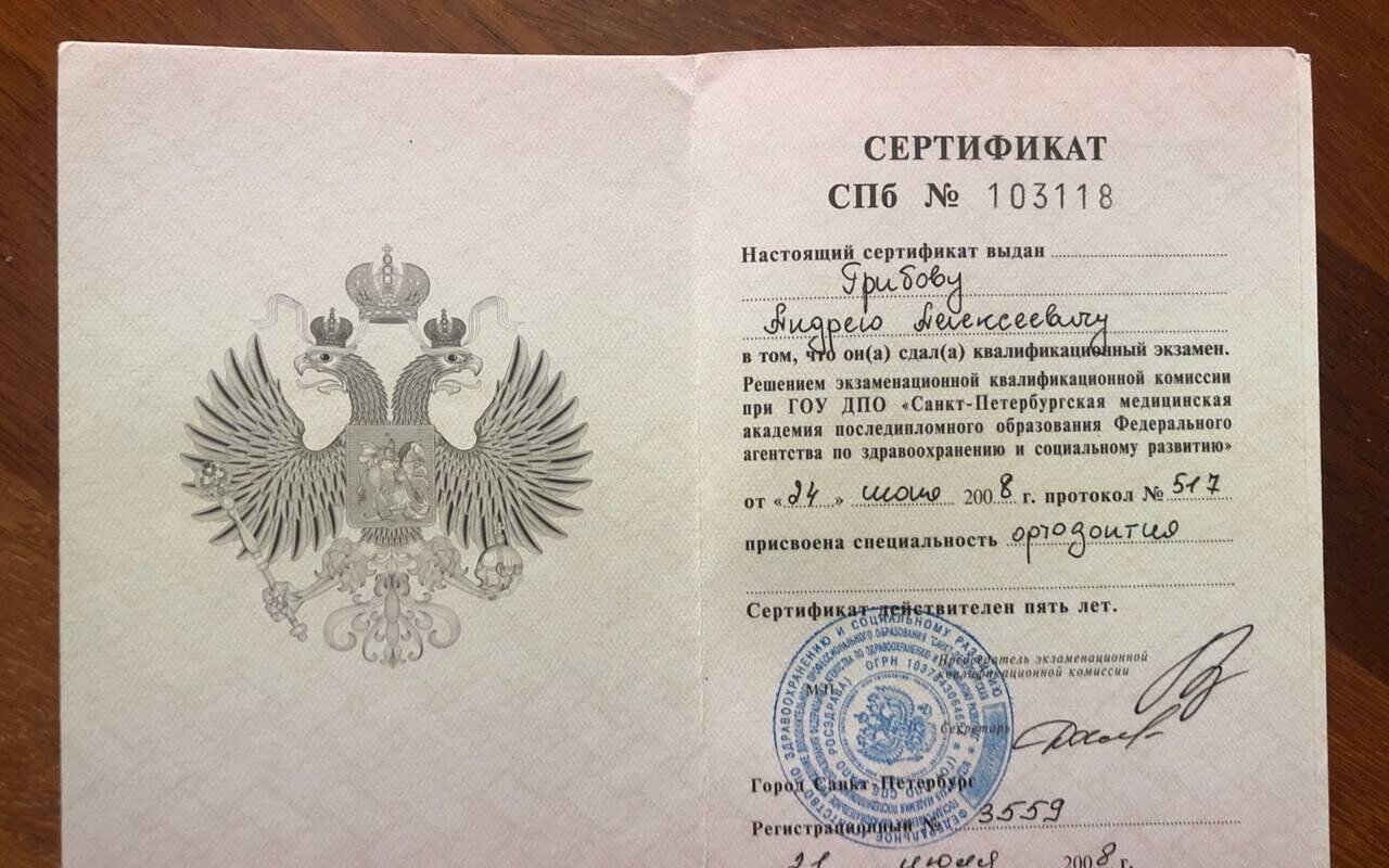 - Есть ли у Грибова Андрея Алексеевича нужные сертификаты?