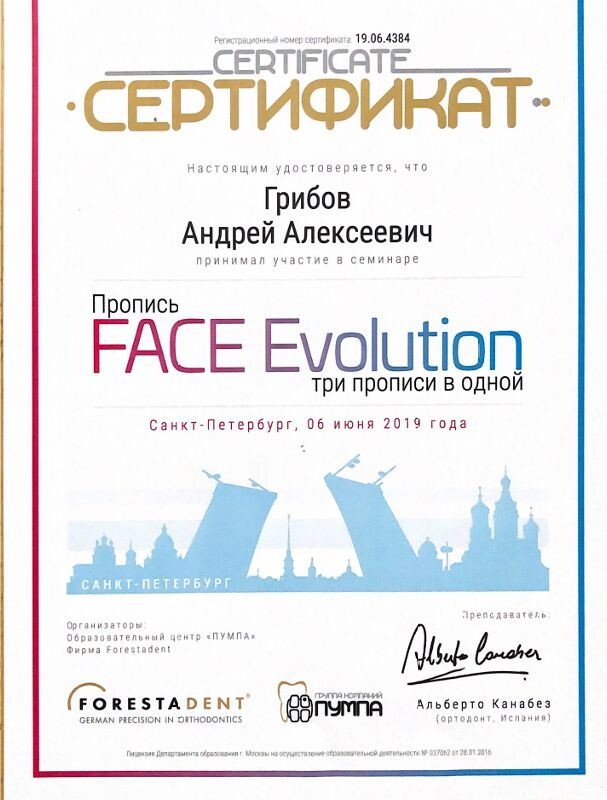 6 июня 2019 — Сертификат 19.06.4384 FACE Evolution nри прописи в одной, Санкт-Петербург
