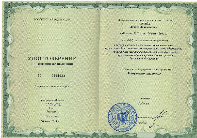 2015 — Российская медицинская академия последипломного образования (РМАПО) (мануальная терапия)