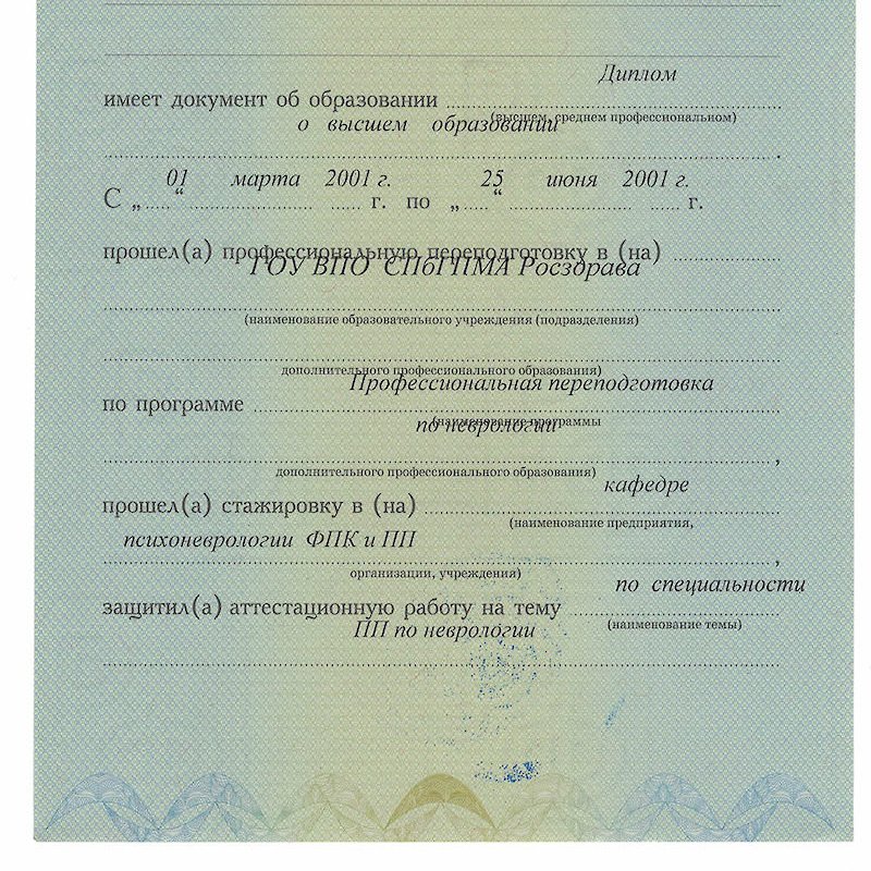 2001 — Санкт-Петербургский государственный педиатрический медицинский университет (неврология)