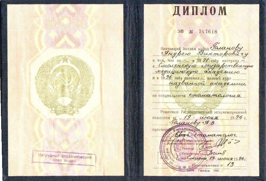 В 1996 году окончил Смоленскую Государственную Медицинскую Академию по специальности «Стоматология». Интернатура при Брянской областной клинической больнице в 1997 году, специальность - стоматология