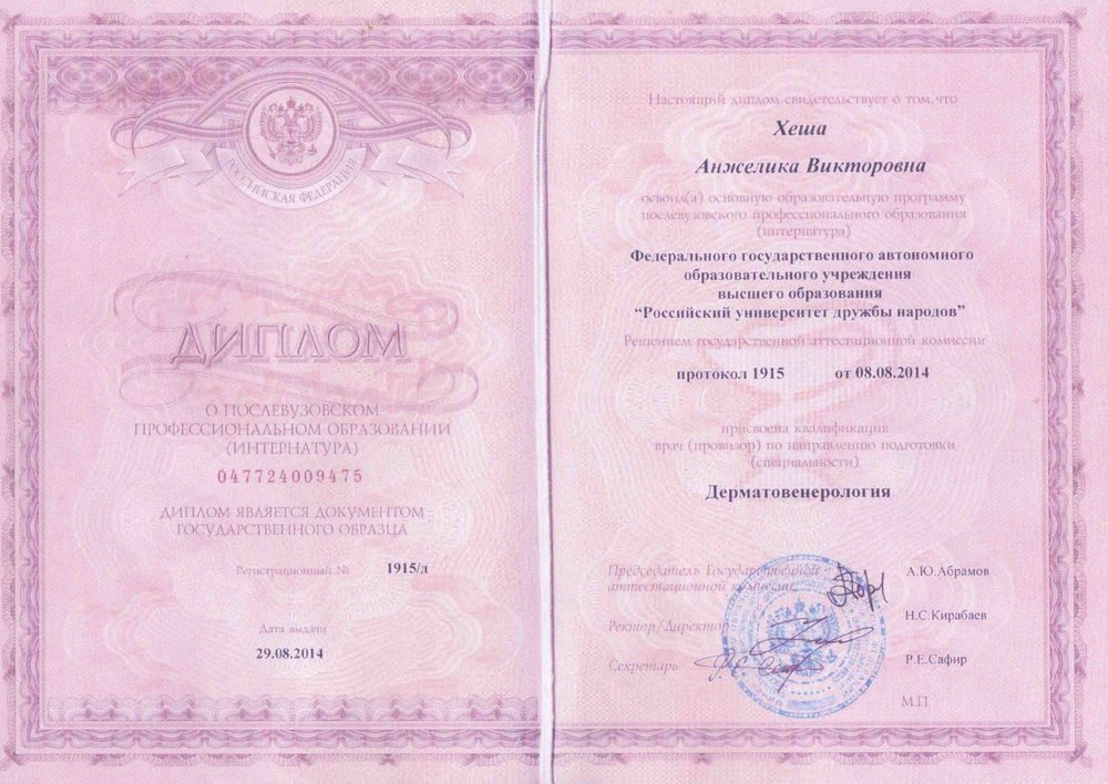 2014 — 2014 г.– ФГАОУ ВО “Российский университет дружбы и народов” – интернатура “Дерматовенералогия”