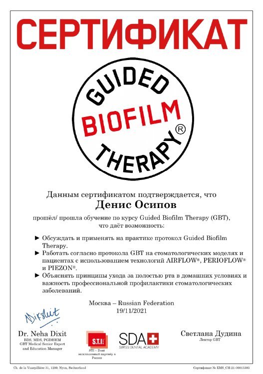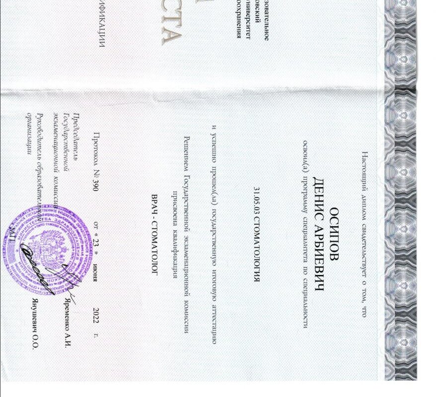 Денис Арбиевич Осипов — профессиональный стоматолог с пятилетним стажем, который заслужил доверие пациентов своей внимательностью, качественными процедурами и дружелюбным отношением. Он умеет быстро и безболезненно выполнять гигиену, а пациенты ценят его индивидуальный подход и высокое качество работы.