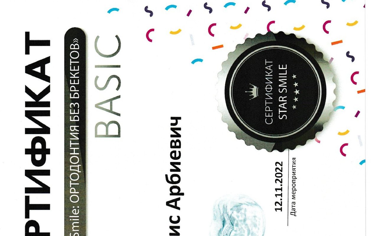2022–2022 — Сертификат StarSmile "Ортодонтия без брекетов"