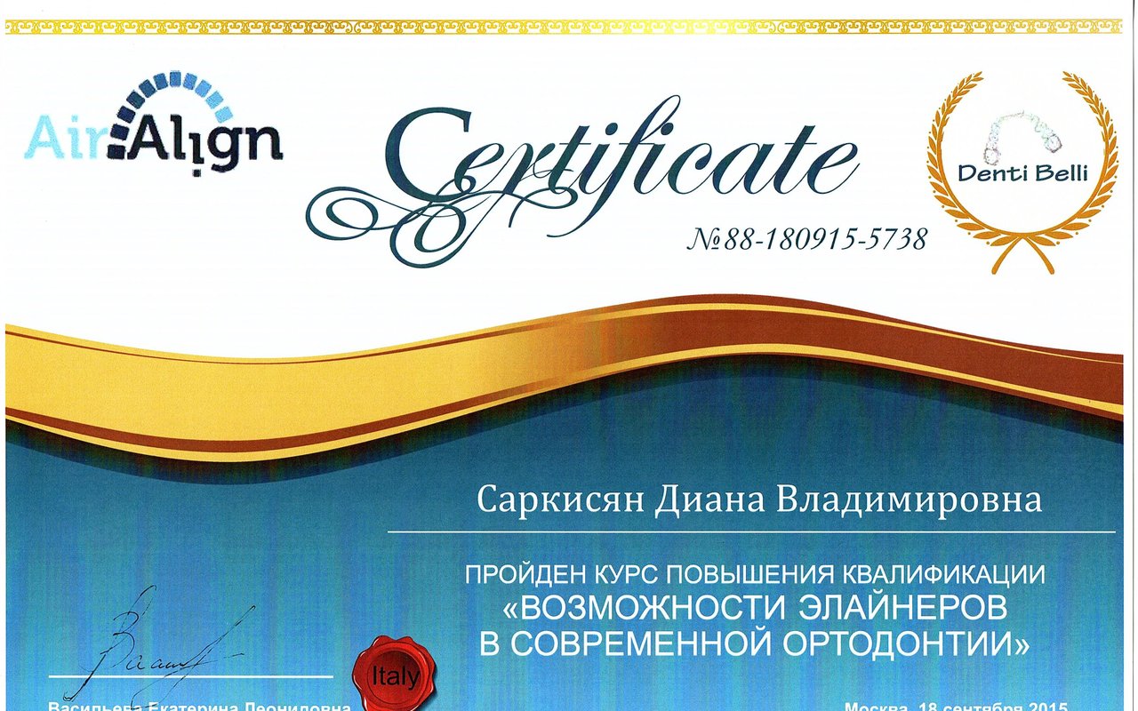 Сентябрь 1997 г. - Эндодонтическое лечение каналов --США. Октябрь 1997 г. -Люминиры -голливудские виниры ---США. Июнь 2012 г. -приняла участие в Nobel Biocare Simposium. Май 2013 г. -приняла участие в международной образовательной конференции по имплантологии и эстетической стоматологии «Интегрированный подход к достижению идеального эстетического результата на имплантатах». Сентябрь 2013 г. -Курсы повышения квалификации «Возможности элайнеров в современной ортодонтии». Декабрь 2013 г. -Приняла участие в международной образовательной конференции по имплантологии и эстетической стоматологии «Актуальные концепции эстетической реабилитации на имплантатах». Май 2016 г. -Виниры "DUO" ----США. Май 2016 г. -Лазер -лечение мягких твердых тканей полости рта