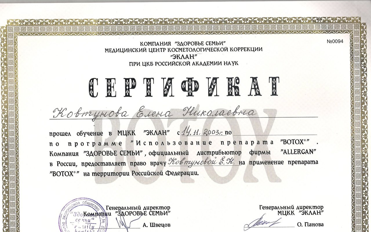 2003 — Учебный курс МЦКК "Эклан" при ЦКБ РАН по программе "Использование препарата "BOTOX", Москва