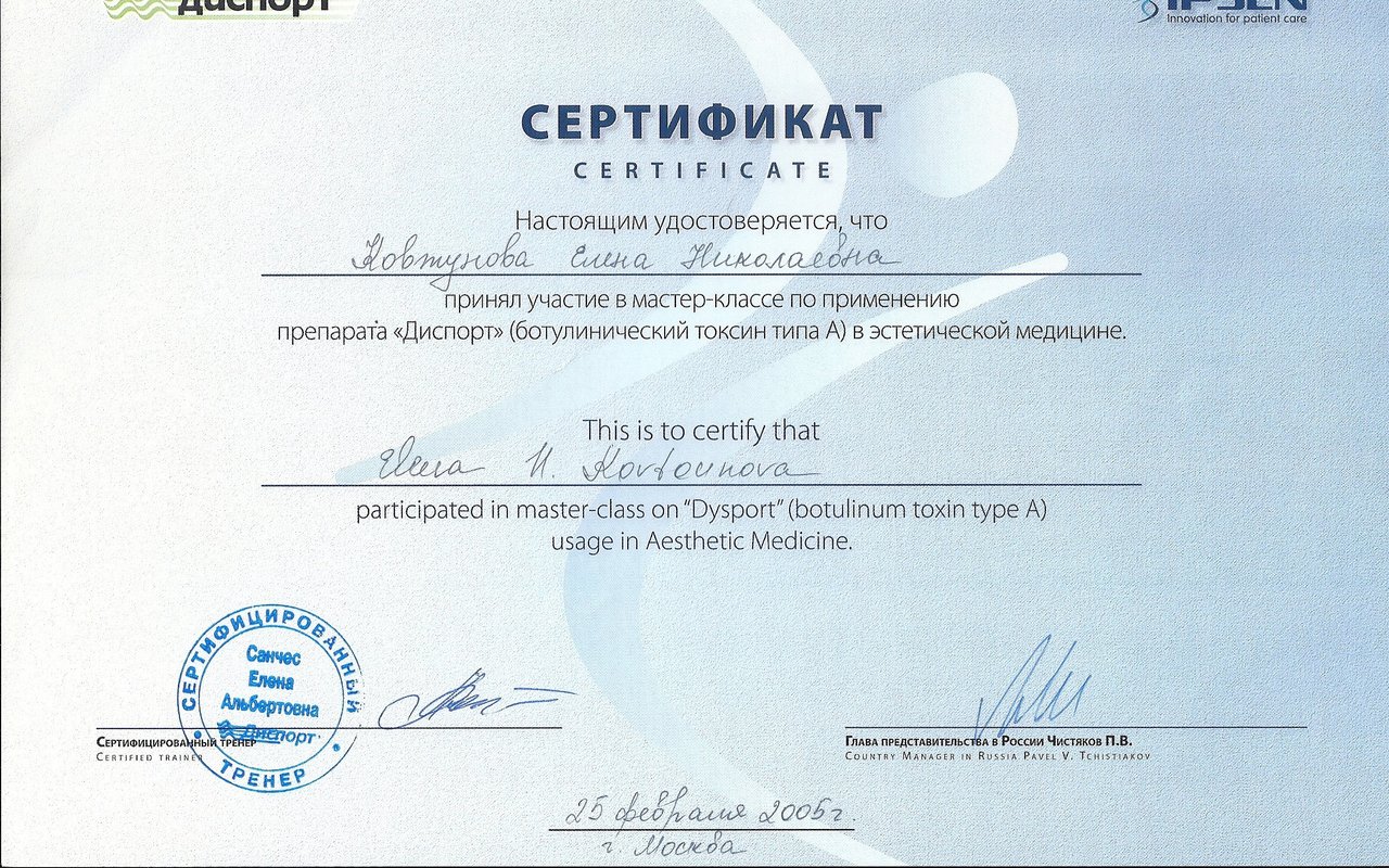2005 — Учебный курс компании "Ипсен" по применению препарата "Диспорт" в эстетической медицине, Москва