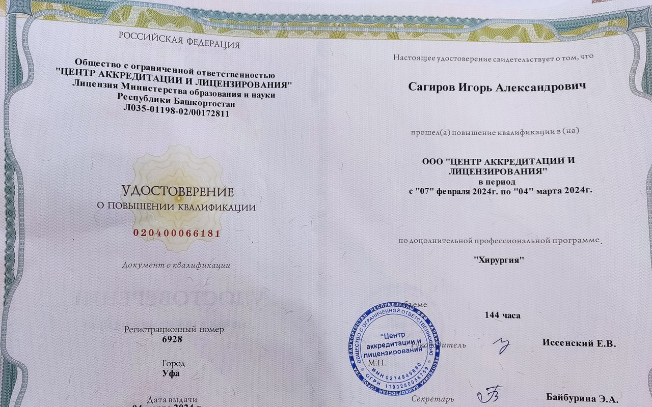 Сертификат по хирургии: срок действия до 26.06.2029