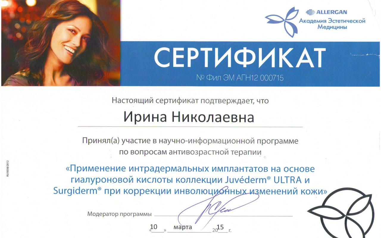 • Сертифицированный специалист в области лазерной косметологии: термолифтинг и фракционный фототермолиз.