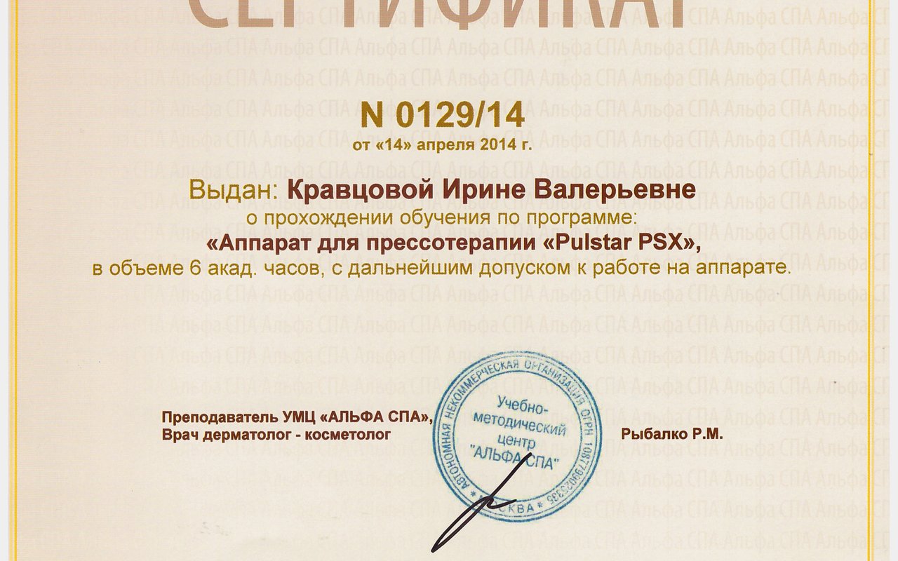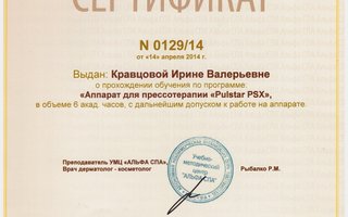 2004 — Курсы повышения квалификации в ГУ "Центральный научно-исследовательский кожно-венерологический институт" Минздрава России по циклу: "Врачебная косметология"