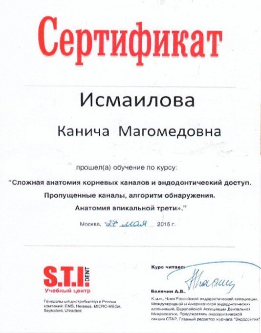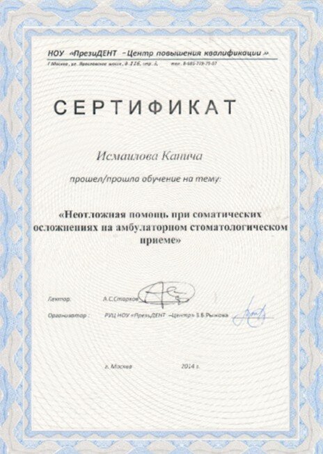 2020 — Удостоверение о повышении квалификации по специальности «Стоматология терапевтическая»