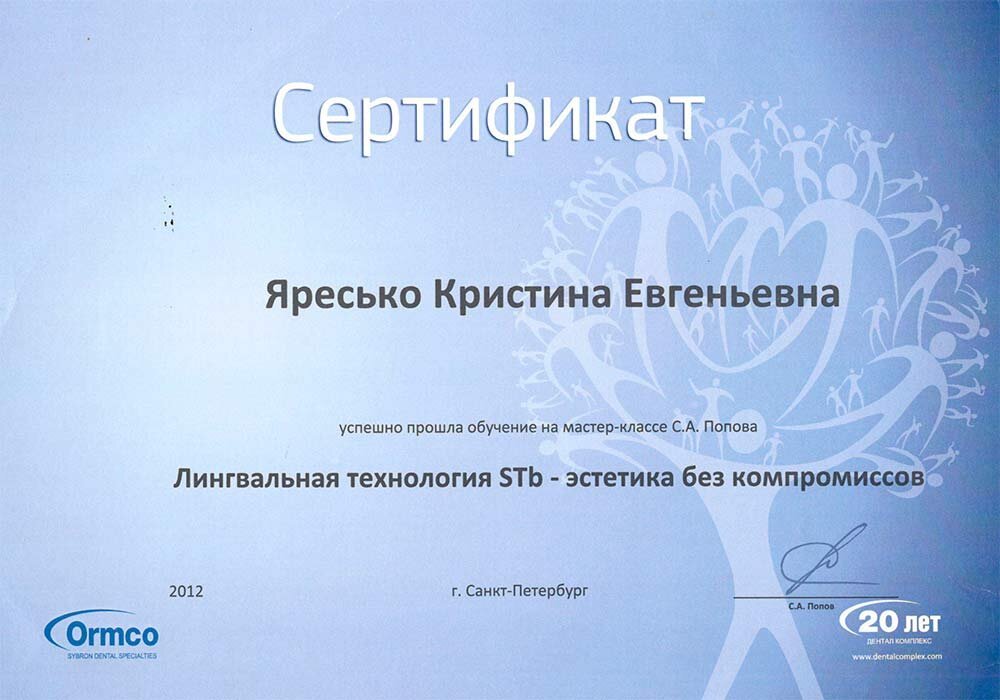 2012 г., Лингвальная технология STb – эстетика без компромиссов, г. Санкт-Петербург;