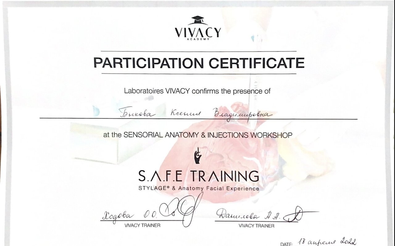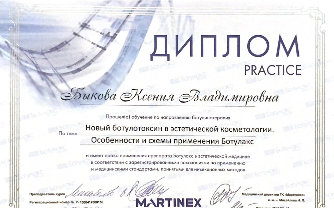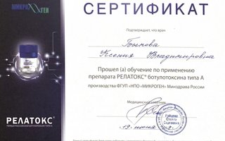* Сертификат о прохождении обучения по препарату ботулотоксина типа А РЕЛАТОКС®