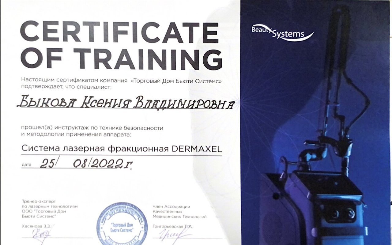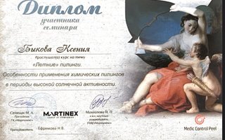 * Диплом о прохождении курса «Летние пилинги: особенности применения химических пилингов в периоды высокой солнечной активности».