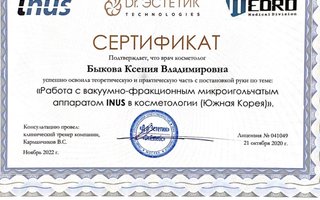 * Свидетельство о прохождении курса обучения по инновационной технологии безинъекционного ремоделирования дермы с использованием препарата PRX-T33