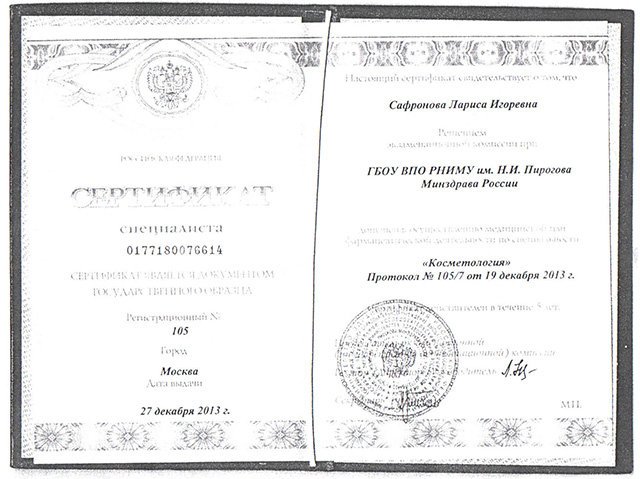 2013г.- прошла курс по программе «Трихология» при факультете повышения квалификации медицинских работников РУДН. 2014г. – прошла обучение компании PALOMAR на лазерных системах PALOMAR ICON, VECTUS при Академии научной красоты. прошла курс по химическим пилингам компании MARTINEX, MARUGA. прошла курс по мезотерапии MARTINEX, является членом Национального общества мезотерапии. прошла курс по инъекционным методикам VISCODERM компании MARUGA. Сертифицированный специалист по введению ботулотоксина: ксеомин, диспорт
