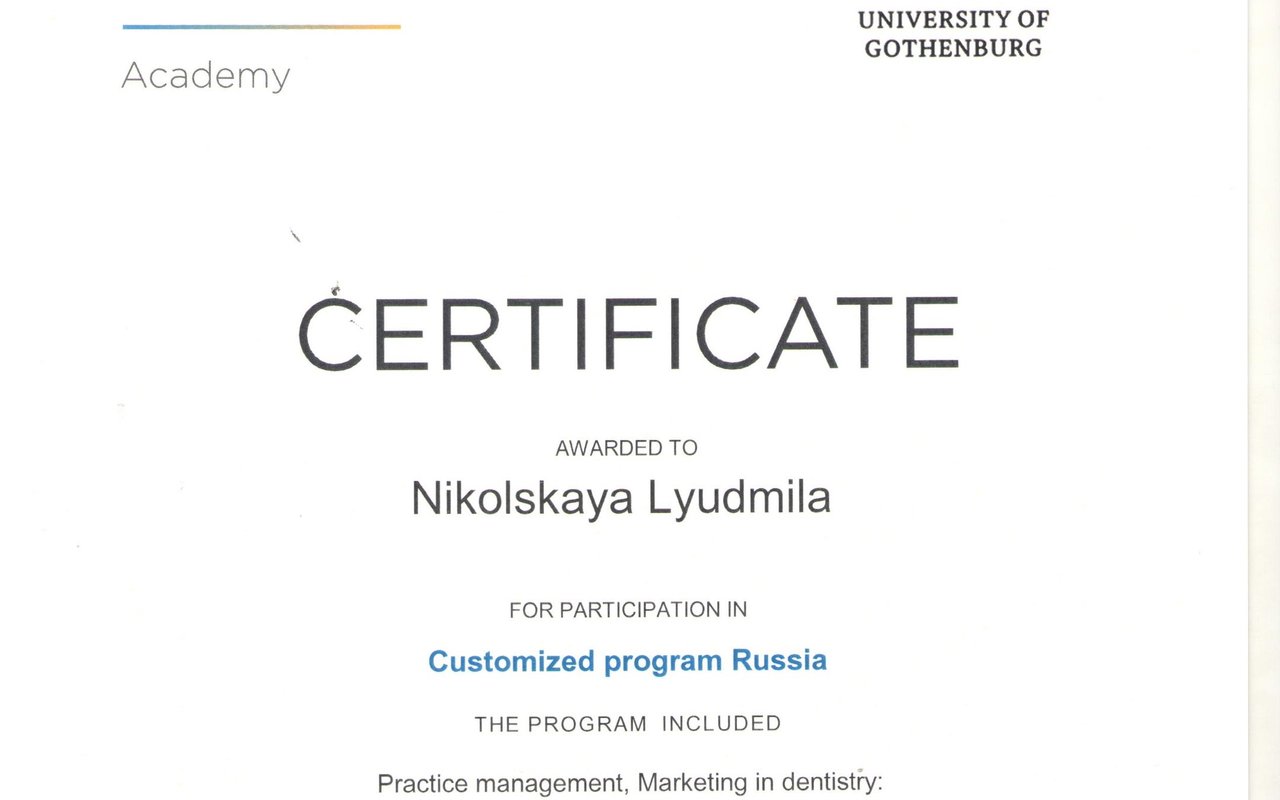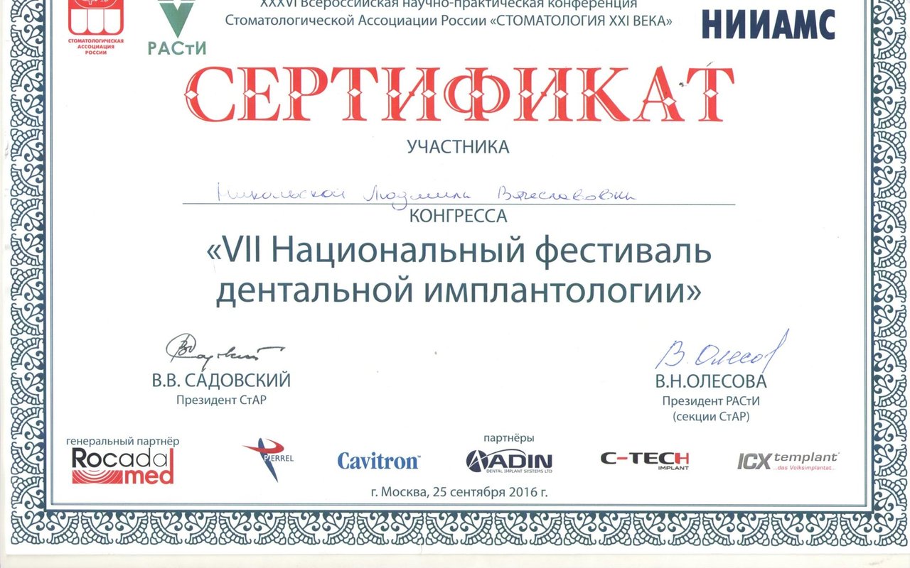 Имплантация – самая передовая методика восстановления утраченных зубов. Людмила Вячеславовна уделяет этому направлению особое внимание, регулярно проходит курсы повышения профессионального мастерства и посещает конференции, чтобы быть в курсе актуальных исследований. Вместе с тем, в работе она отдает предпочтение надежным, проверенным временем методикам и имплантологическим системам с большой научной базой и многолетним успешным клиническим опытом. Она работает с премиальной шведской системой Astra Tech и надежной системой Osstem.