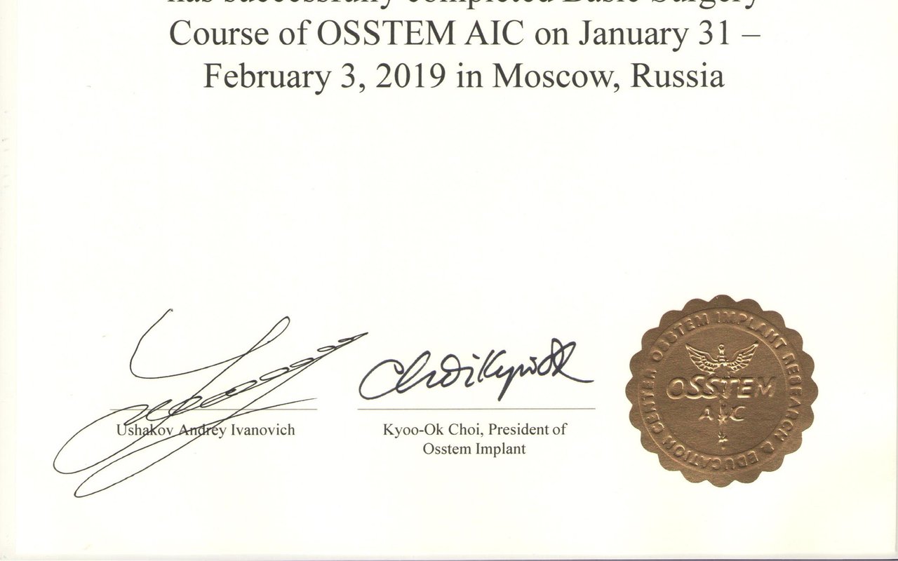 2019 — Практический курс «Хирургия в дентальной имплантации» (AIC, Osstem)