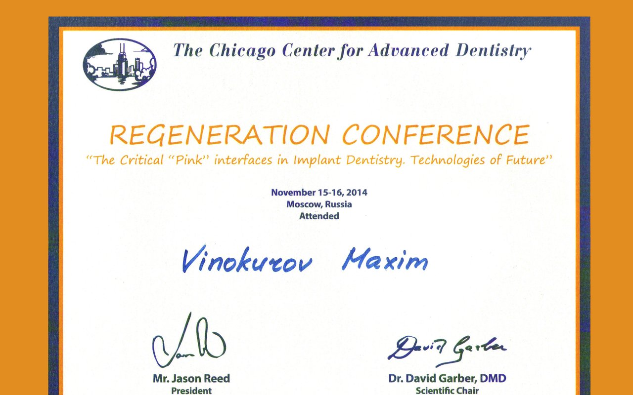2015 — Конференция по регенерации «Критические «розовые» профили в имплантологии. Технологии будущего» Чикагский центр современной стоматологии, Д. Гарбер, г. Москва.