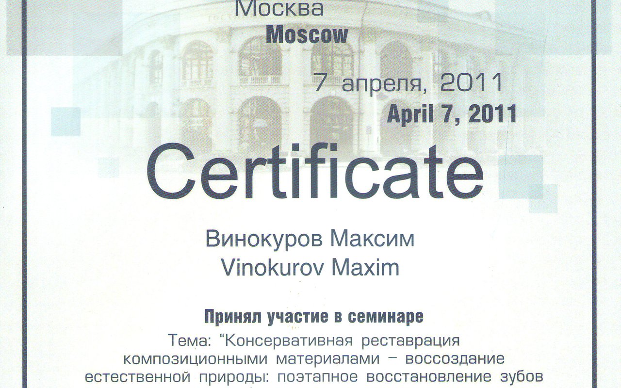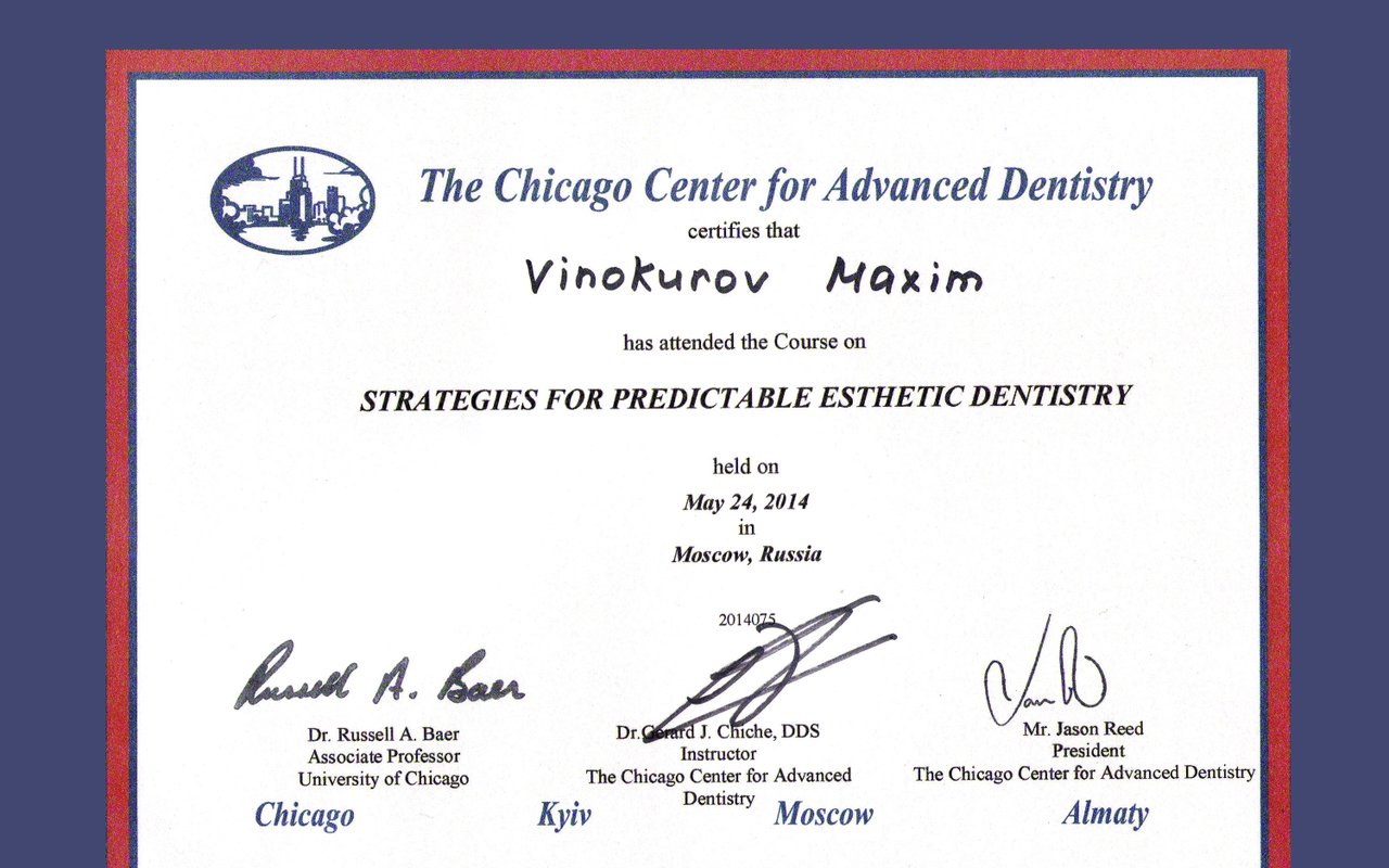 2015 — Курс "Стратегии предсказуемой эстетической стоматологии" Чикагский центр современной стоматологии, Ж. Шиш, г. Москва.