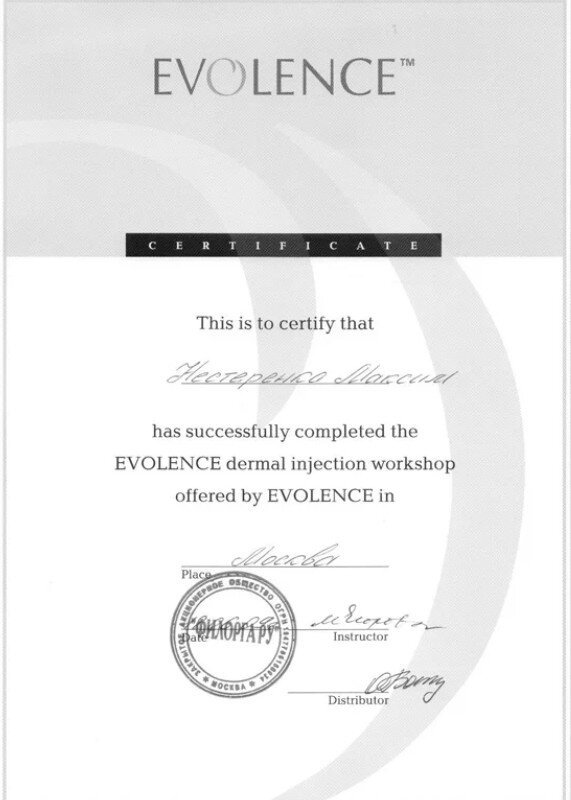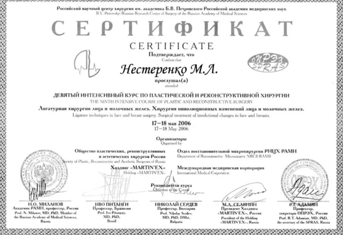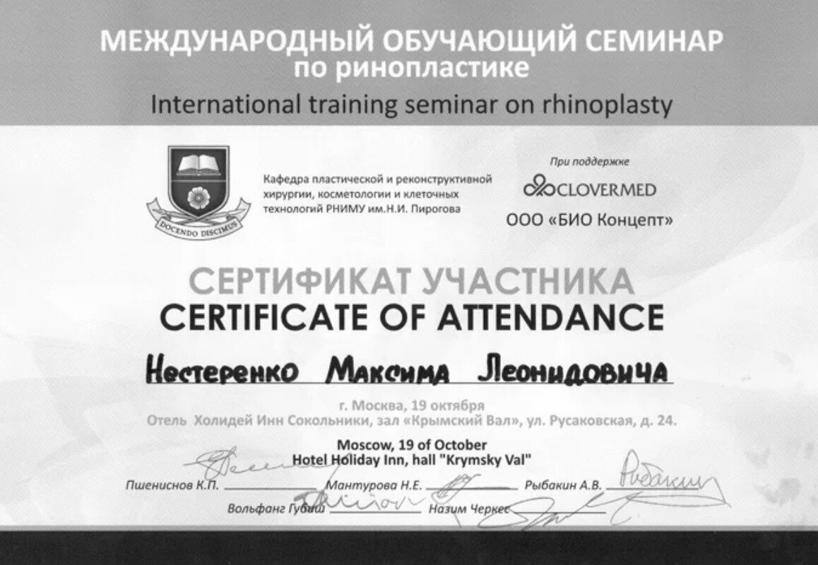 2009 — Сертификат о присвоении Нестеренко Максиму Леонидовичу специальности Челюстно-лицевая хирургия