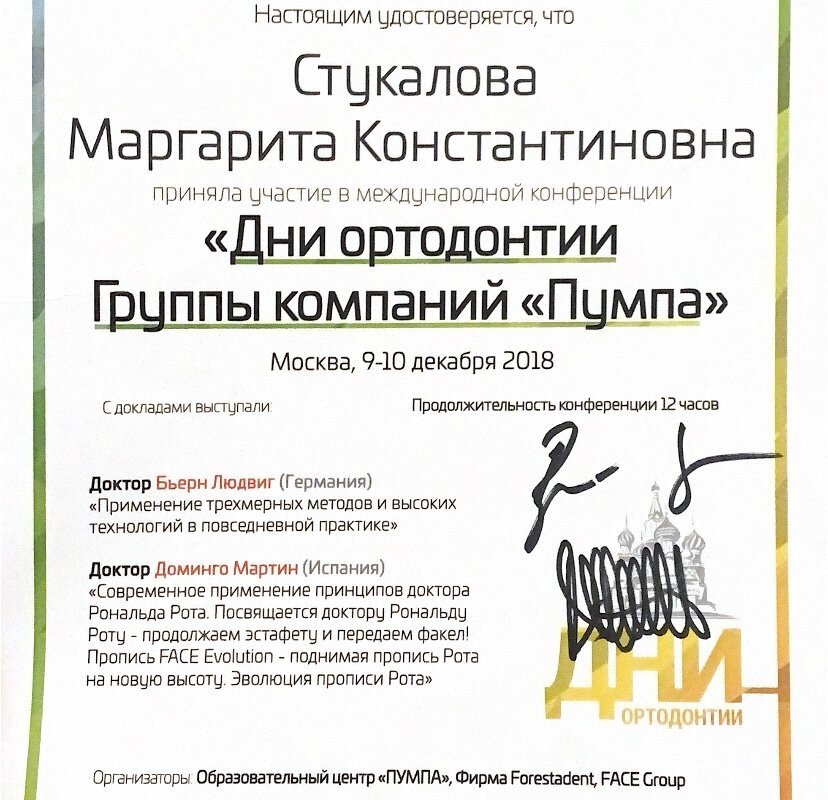 2018–2018 — Дни ортодонтии Группы компаний «Пумпа" Образовательный центр «Пумпа», Фирма Forestadent, FACE Group