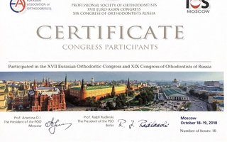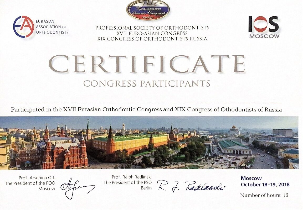 - Participated in the 17 Eurasian Orthodontic Congress and 19 Congress of Orthodontists of Russia 2018 (Профессиональное общество ортодонтов)