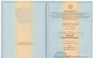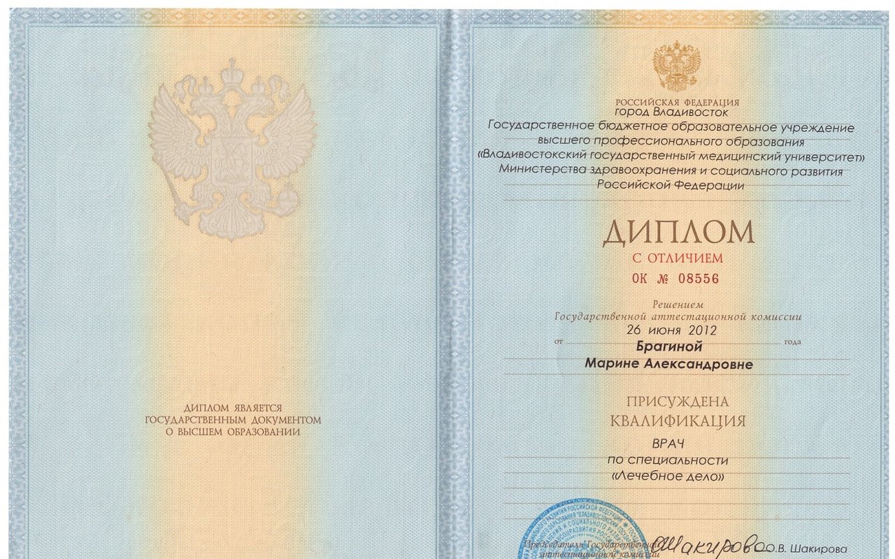 2012 — Федеральное государственное бюджетное образовательное учреждение высшего образования «Дальневосточный государственный медицинский университет» Министерства здравоохранения Российской Федерации. Специальность: Лечебное дело, от 26 июня 2012 г.