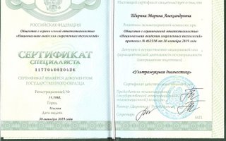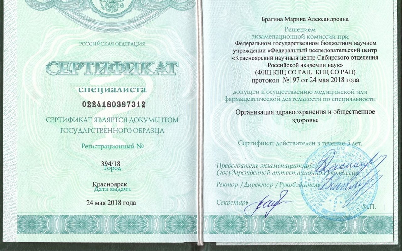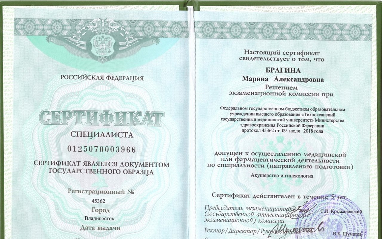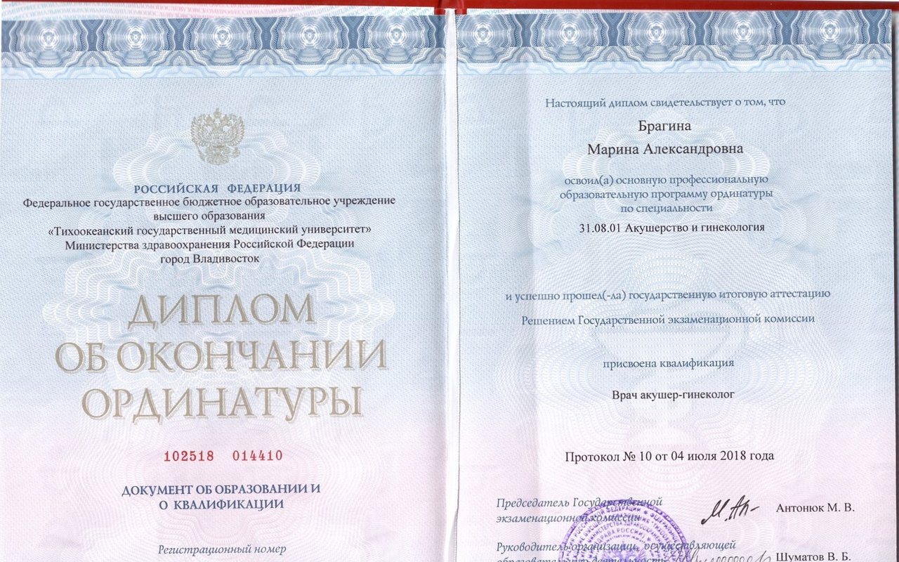 2018 — Федеральное государственное бюджетное образовательное учреждение высшего образования «Тихоокеанский государственный медицинский университет» Министерства здравоохранения Российской Федерации. Ординатура. Квалификация: врач-акушер-гинеколог, от 11 июля 2018