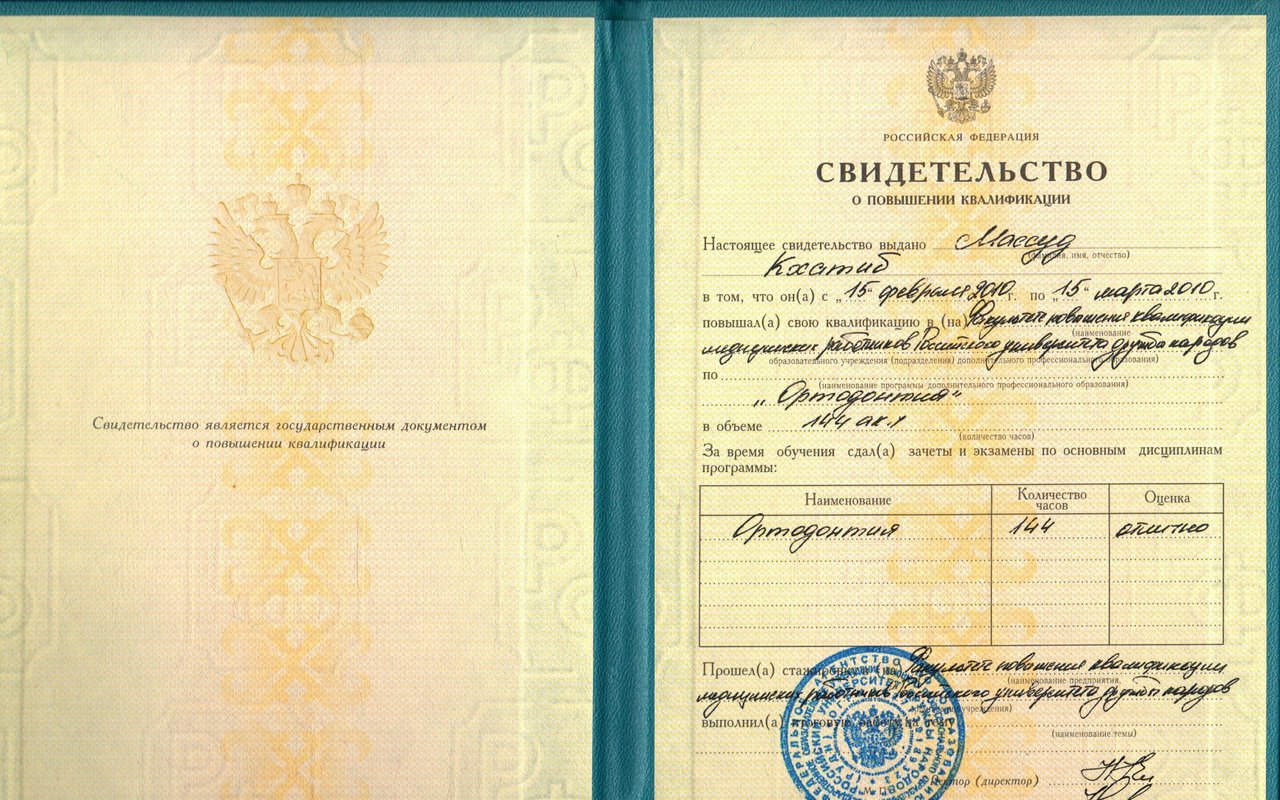 1997–2000 — Обучение в клинической ординатуре по специальности «Ортодонтия» на кафедре стоматологии детского возраста Тверской государственной медицинской академии с выдачей сертификата международного образца