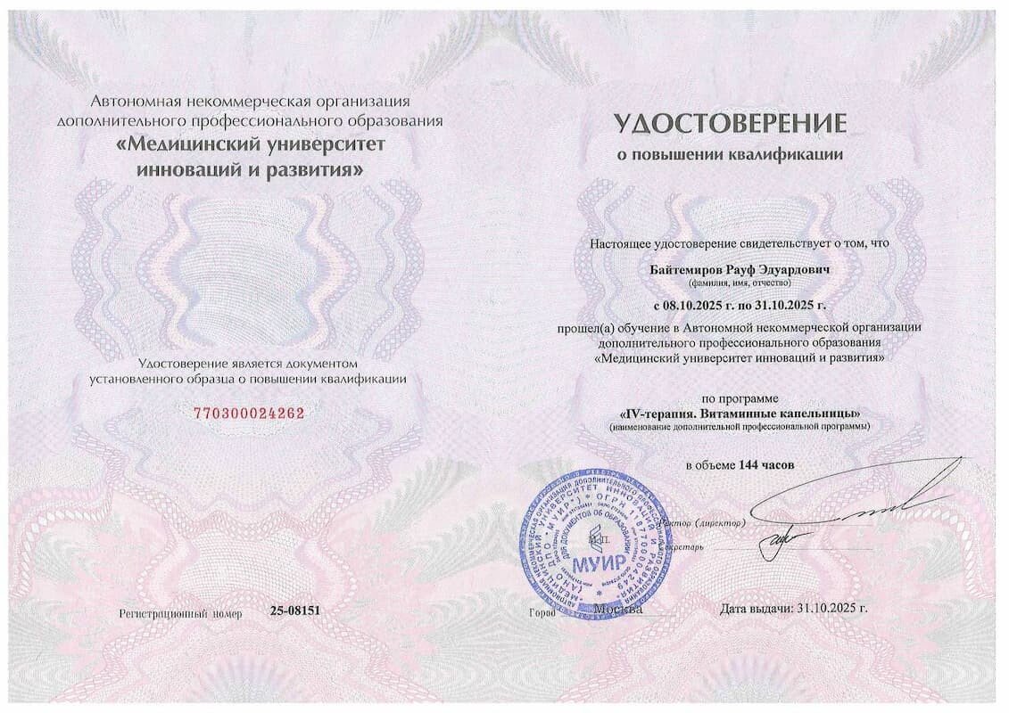 Рауф Эдуардович — внимательный и опытный специалист, который сочетает научный подход и индивидуальное отношение к каждому пациенту. Основное направление его работы — инфузионная терапия, направленная на восстановление организма, коррекцию нутритивных дефицитов, детоксикацию и поддержание здоровья на клеточном уровне. В своей практике доктор применяет современные протоколы IV-терапии, подбирая состав инфузионных коктейлей строго индивидуально — в зависимости от анализов, состояния здоровья и целей пациента.