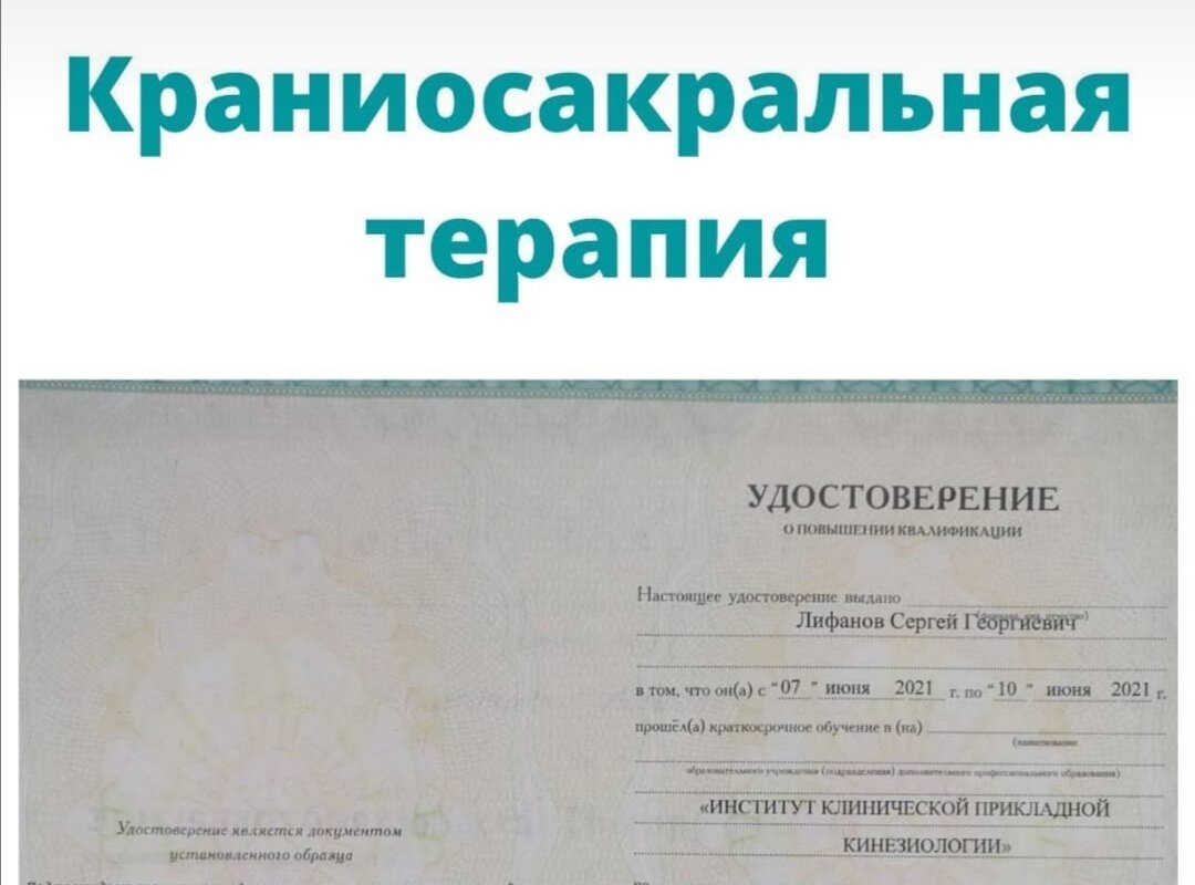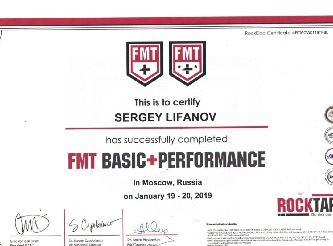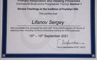 2019 — Сертификат Русской высшей школы остеопатической медицины по специальности "Остеопатия" по теме "Фасциальные, карниальные техники. Мышечно-энергетические и прямые техники в диагностики и коррекции соматических дисфункций опорно-двигательного аппарата"