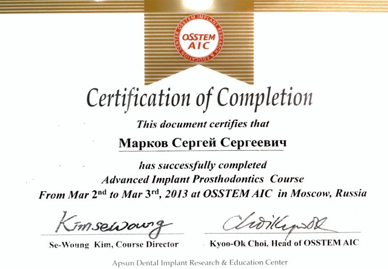2009 — Протезирование на дентальных имплантатах. Учебный центр OSSTEM.