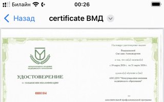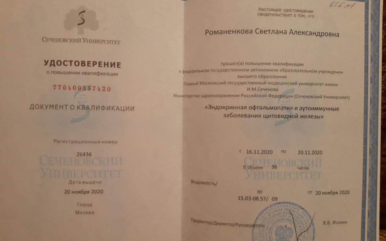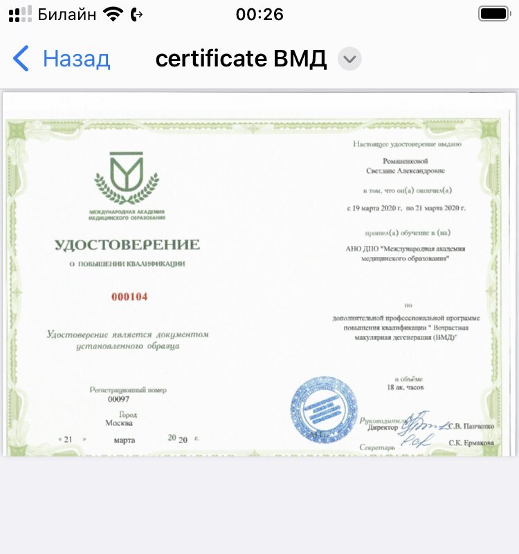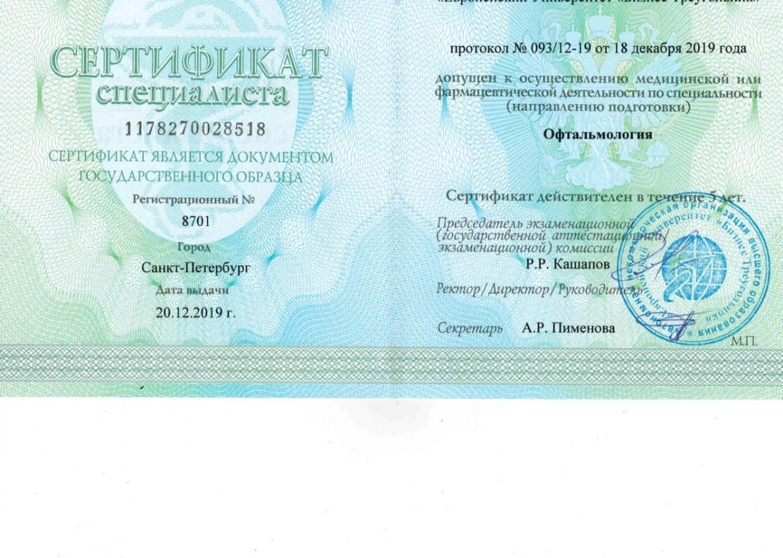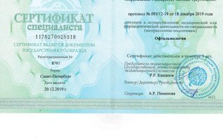2019–2019 — Сертификат по специальности "Офтальмология".