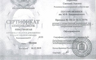 1976 — Клиническая ординатура на базе Детской городской клинической больницы № 1 г. Москвы по специальности «Детская офтальмология»